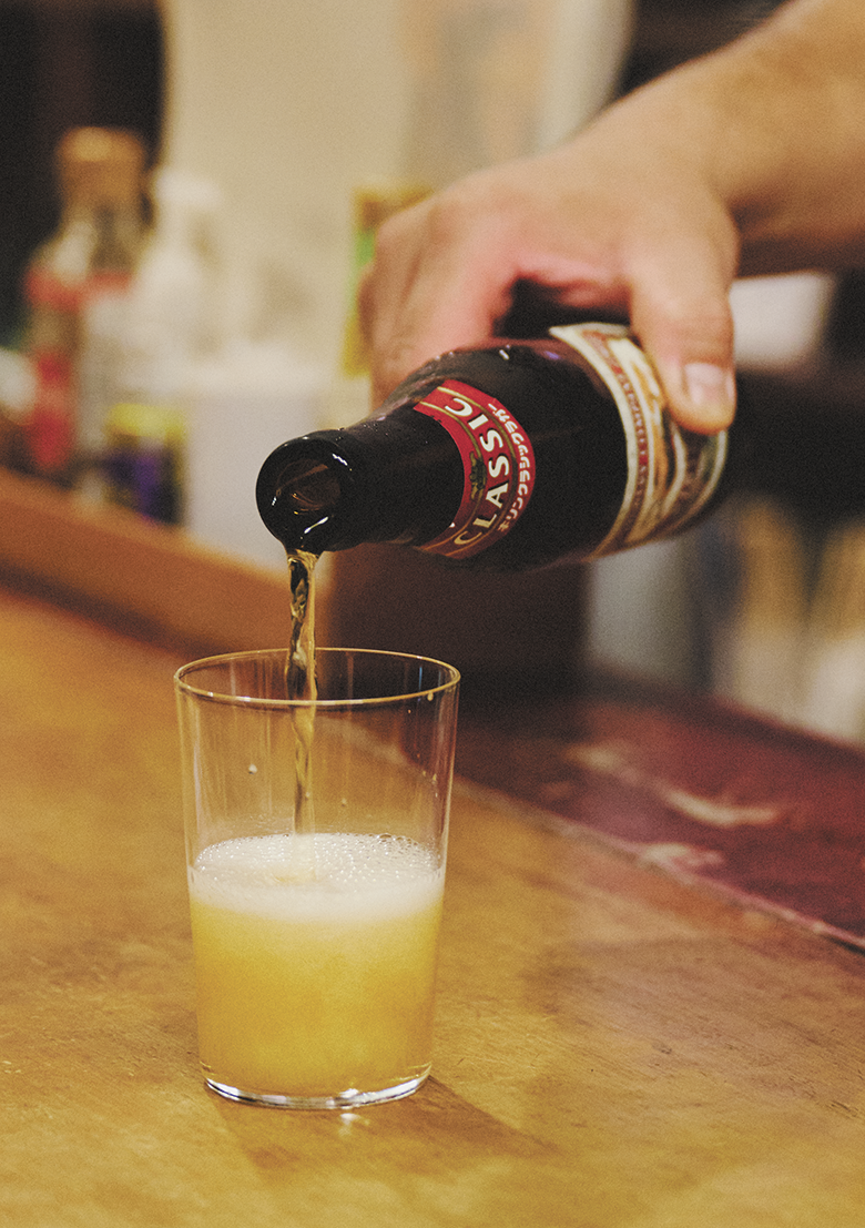 シンスケのビールグラスは小瓶ならきっちり2杯注げる仕様に。「ちょっと余ったり、足りなかったりするのが嫌で、泡の配分もきれいに収まるようガラスの厚みなど木村硝子店さんのご協力で実現しました」と店主の矢部さん。注いでもらうと本当にきっちり2杯分!