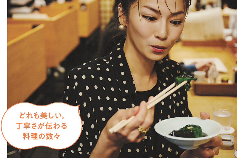 「料理はどれも本当に美しく見た目からもおいしさが伝わります。濃厚な黒胡麻ペーストの上品な甘さが広がる『ほうれん草の胡麻和え』は、日本酒と合いますね。『したし豆』はからし醤油でほんのり辛みを加えるのが好き。こんにゃくと豆の食感の違いも楽しめます」