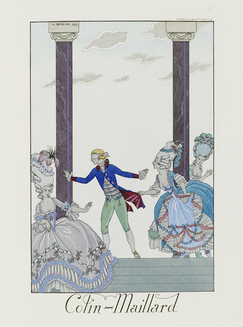 アール・デコ期を代表する挿絵画家ジョルジュ・バルビエは、時代考証をふまえつつ、1920年代の洗練された感性を通して、18世紀の服飾やインテリアを細部まで表現しました。彼の挿絵にはそれとわかるようにマリー・アントワネットやヴェルサイユにおける王妃ゆかりの地が取り入れられました。この「目隠し鬼」を描いた作品では、高く髪を結い上げ羽やリボン、花の飾りをつけて、横に大きく広がる宮廷ドレスを着た人びとが描かれています。