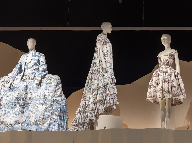 左右は、トワル・ド・ジュイのプリント地による、アンドレア・グロッシのアンサンブル(2019年ポリモーダ卒業制作)とヴィヴィアン・ウエストウッドのパニエドレス(1996年春夏コレクション)。中央、フリルのトレーンとティアードスカートが印象的なイヴニングドレスは、アーデムのコレクション(2022年春夏)。作品を高所に並べたロンドン展のスペクタクルな演出とは趣向を変えて、横浜ではデザインのディテールに迫れる展示を予定しています。