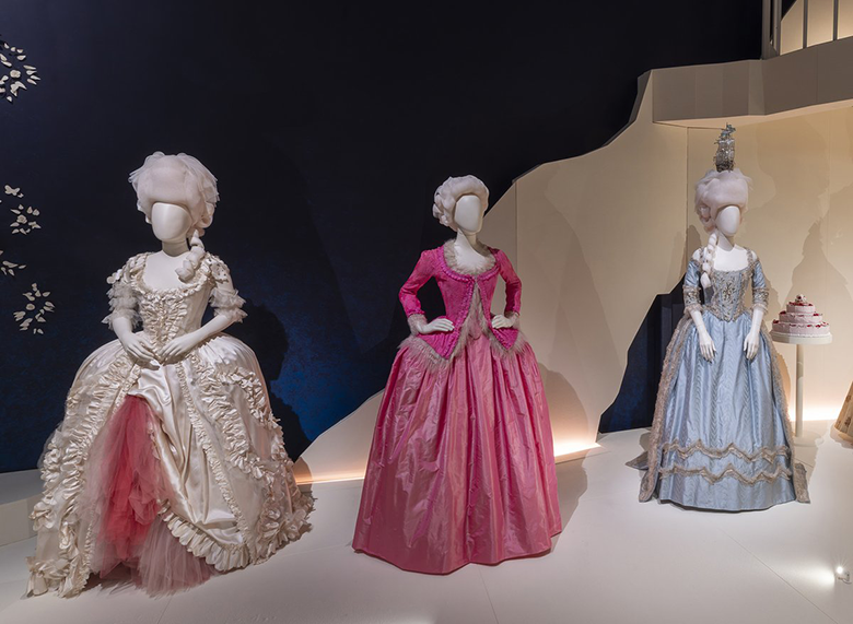 ソフィア・コッポラ脚本・監督、キルスティン・ダンスト主演の映画『マリー・アントワネット』。ピンヒールのパンプス、ポップミュージック、色とりどりのマカロンなど、18世紀の宮廷に「現代」を織り込んだ構成が話題になりました。第79回アカデミー賞でミレーナ・カノネロが衣裳デザイン賞を獲得、その栄えあるドレスも出展されます(右写真)。左から「ケーキを食べればいいじゃない」「礼拝堂」「庭園」のコスチューム。