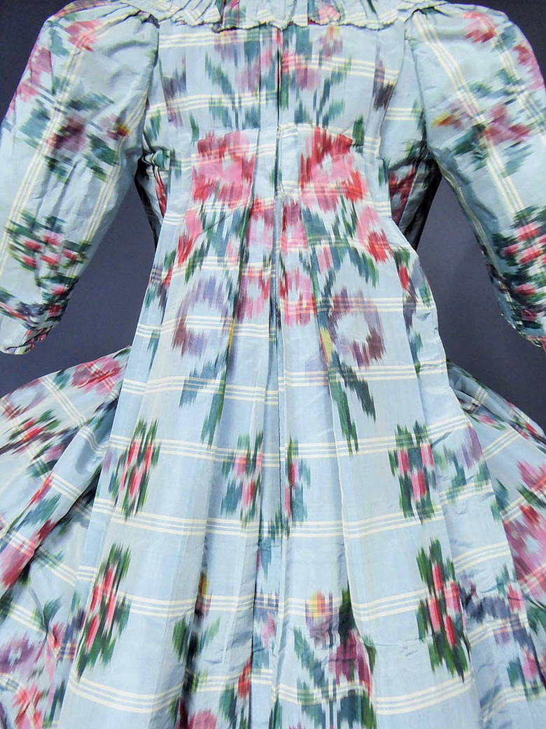 白いストライプの走る絹地に、つるバラと花束の連続模様が施されています。少しかすれたような、やさしい風合いの花柄は、織る前に経糸を束ねて絞り染めして(つまり模様を計算して糸を先染めして!)織り出されたもの。この高度な技術を要するシネ・シルク—日本の絣に相当します—も、マリー・アントワネットのお好みでした。