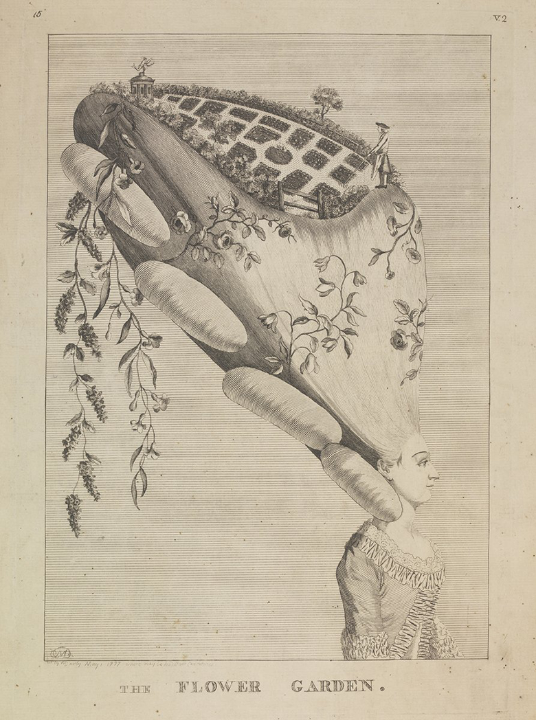 結髪師レオナール・オーティエとモード商のローズ・ベルタンが生み出した、高く盛られた髪型や華美な頭飾りは、この時代の宮廷に特徴的な装いと言えるでしょう。奇抜な髪型が流行すると、風刺画家たちはその姿を大げさに描き出しました。この作品のテーマは「花園」です。熊手を持った庭師のいる庭園や、垂れ下がる花々で飾りたてられた「髪」は、女性の顔の数倍のスケールで描かれています。