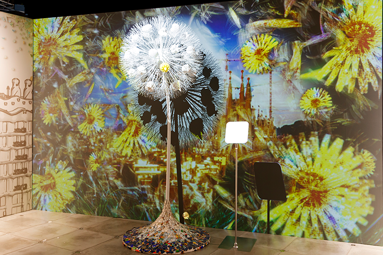 ネイキッドの参加型アート《DANDELION》によってガウディの意思が世界で広まっていく様子を表した、インスタレーション。種が風に乗り花を咲かせ、未来を形づくる人々へと渡されていく。