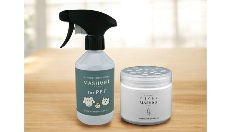 「MASHUU For PET」はトイレの砂やワンちゃん猫ちゃんの粗相の消臭、また散歩前に洋服にスプレーすることで虫よけ効果を実感できます。「MASHUU置き型消臭ゲル」は室内、車内、台所、冷蔵庫、げた箱などに置くだけで消臭、防カビ、除菌効果を発揮します。プレゼントはペット用スプレー300ミリリットル( 3400円/税込み)と置き型ゲル130グラム(1900円/税込み)のセットで。