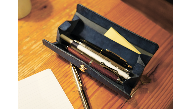 カフェやオフィスでも場所をとらずに使える、トレイ型に変形するスリムなレザーペンケース。片手で瞬時に開くと大きく展開し、中身が一目で見渡せる設計で、必要なペンをスムーズに取り出せます。机の上を広く使える省スペース設計も特長。イタリアンレザーは使うほどに風合いが増し、愛着が深まります。機能性と美しさを兼ね備えた、日常を快適にするレザーペンケースです(12000円/税込み)。6色展開。※色は選べません。
