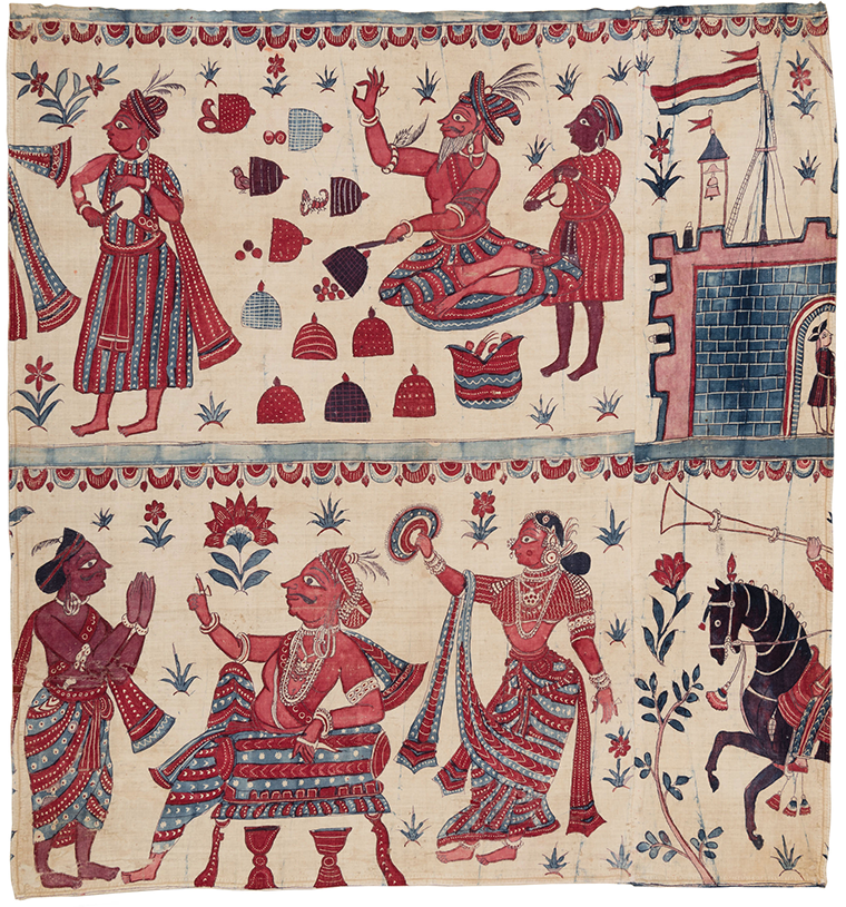 画像左)《白地人物城郭文様更紗裂》18世紀 Karun Thakar Collection, London. Photo by Desmond Brambley