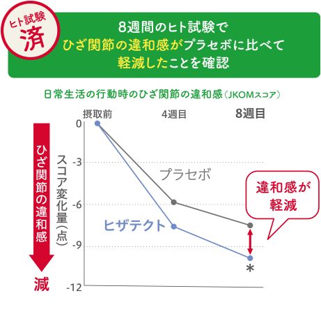 【対象者】ひざ関節に違和感や不快感を持つ健常成人 【試験食】ヒザテクト(73名)とプラセボ(71名) 【摂取期間】8週間 ※プラセボとは機能性関与成分を含まない見た目や味が類似した食品のこと。 ※JKOMスコアとは膝の痛みやこわばり、日常生活の状態、ふだんの活動、健康状態についての設問で構成される評価方法。