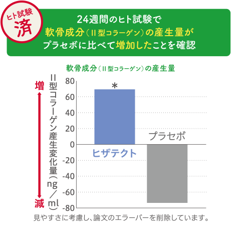 【対象者】ひざ関節に違和感や不快感を持つ健常成人 【試験食】ヒザテクト(41名)とプラセボ(40名) 【摂取期間】24週間 ※プラセボとは機能性関与成分を含まない見た目や味が類似した食品のこと。 ※Ⅱ型コラーゲン合成マーカー(関節軟骨に特異的に存在するⅡ型コラーゲンが合成された際に生じたペプチドが血液中に放出されたもの)を測定。